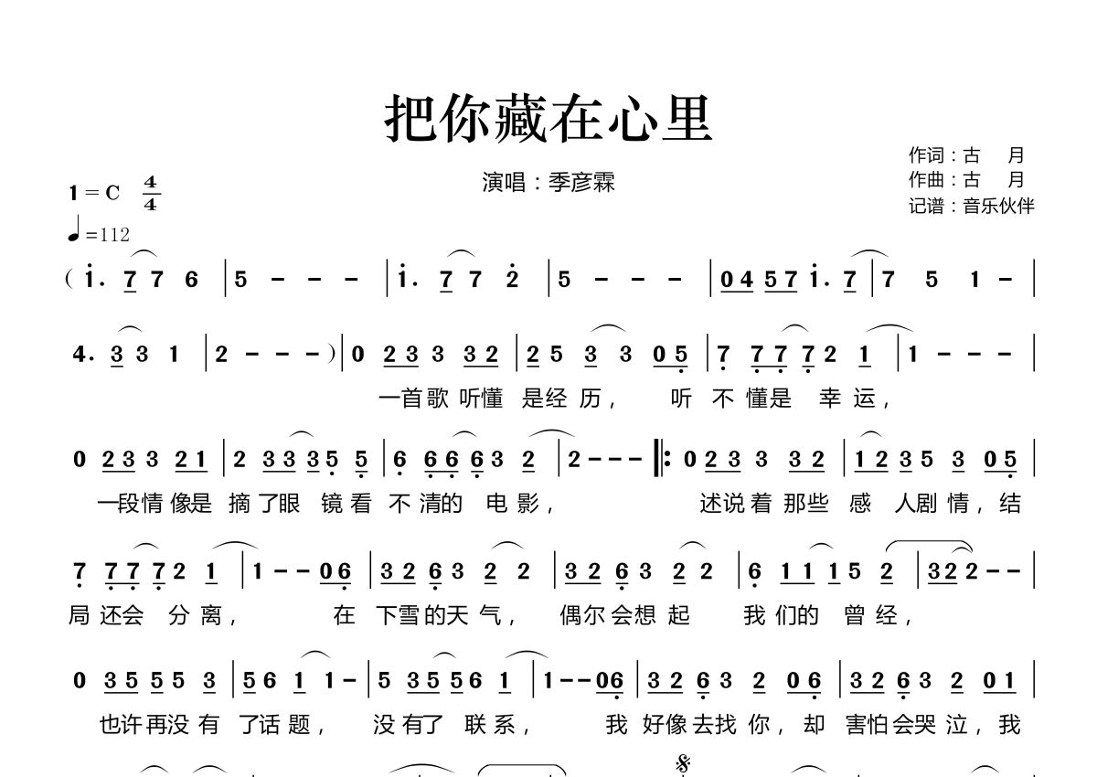 《把你藏在心里》是季彦霖演唱的一首歌曲,拍号为4/4拍,歌曲速度为每分钟112拍,这份简谱共有一张高清图谱,图谱由 @音乐伙伴 编配上传。