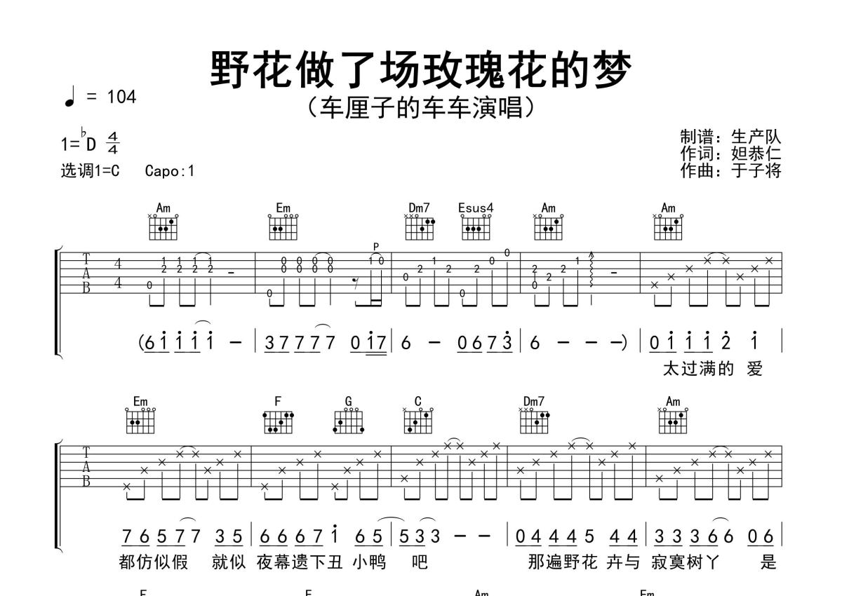 《野花做了场玫瑰花的梦(粤语版)》是粤语版演唱的一首歌曲,精编完美版,拍号为4/4拍,歌曲速度为每分钟104拍,歌曲原调为Db调,但由于原调指法比较难,为了方便弹奏,本吉他谱采用的是C调指法编配,变调夹1品弹奏即为原调,当然也可以根据自己的音域改变变调夹位置,或者通过改变和弦调性,以方便自己弹奏,这份吉他谱共有两张高清图谱,图谱由 @生产队 编配上传,图谱使用六线谱编配,包含吉他和弦指法、简谱以及歌词部分,使用这份野花做了场玫瑰花的梦(粤语版)吉他谱,可以让你更加方便地掌握这首歌曲的弹唱技巧,快来尝试吧。车厘子的车车演唱的歌曲《野花做了场玫瑰花的梦(粤语版)》原版吉他谱,含精准的前奏、间奏solo编配,精编完美版,优质推荐!。