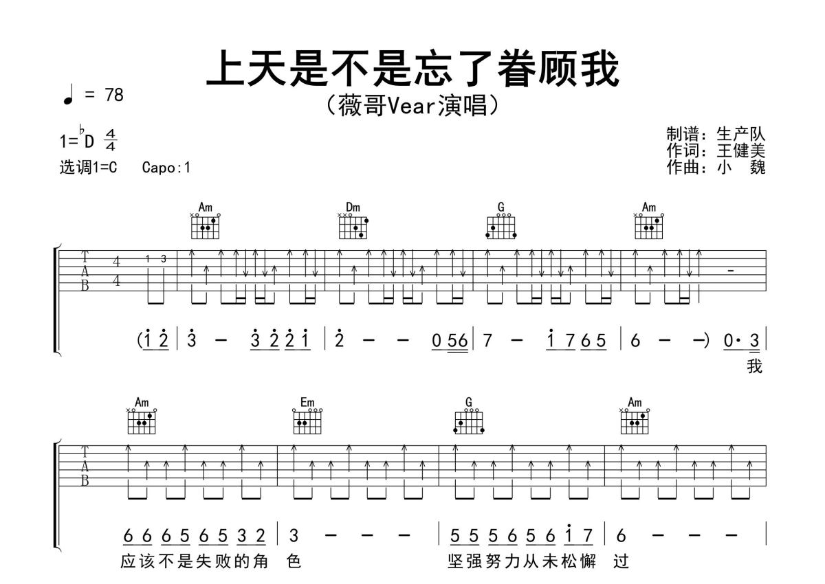 《上天是不是忘了眷顾我》是薇哥Vear演唱的一首歌曲,精编完美版,本吉他谱采用的是C调指法编配,这份吉他谱共有两张高清图谱,图谱由 @生产队 编配上传,图谱使用六线谱编配,包含吉他和弦指法、简谱以及歌词部分,使用这份上天是不是忘了眷顾我吉他谱,可以让你更加方便地掌握这首歌曲的弹唱技巧,快来尝试吧。薇哥Vear演唱的歌曲《上天是不是忘了眷顾我》原版吉他谱,含精准的前奏、间奏、尾奏solo编配,精编完美版,优质推荐!。