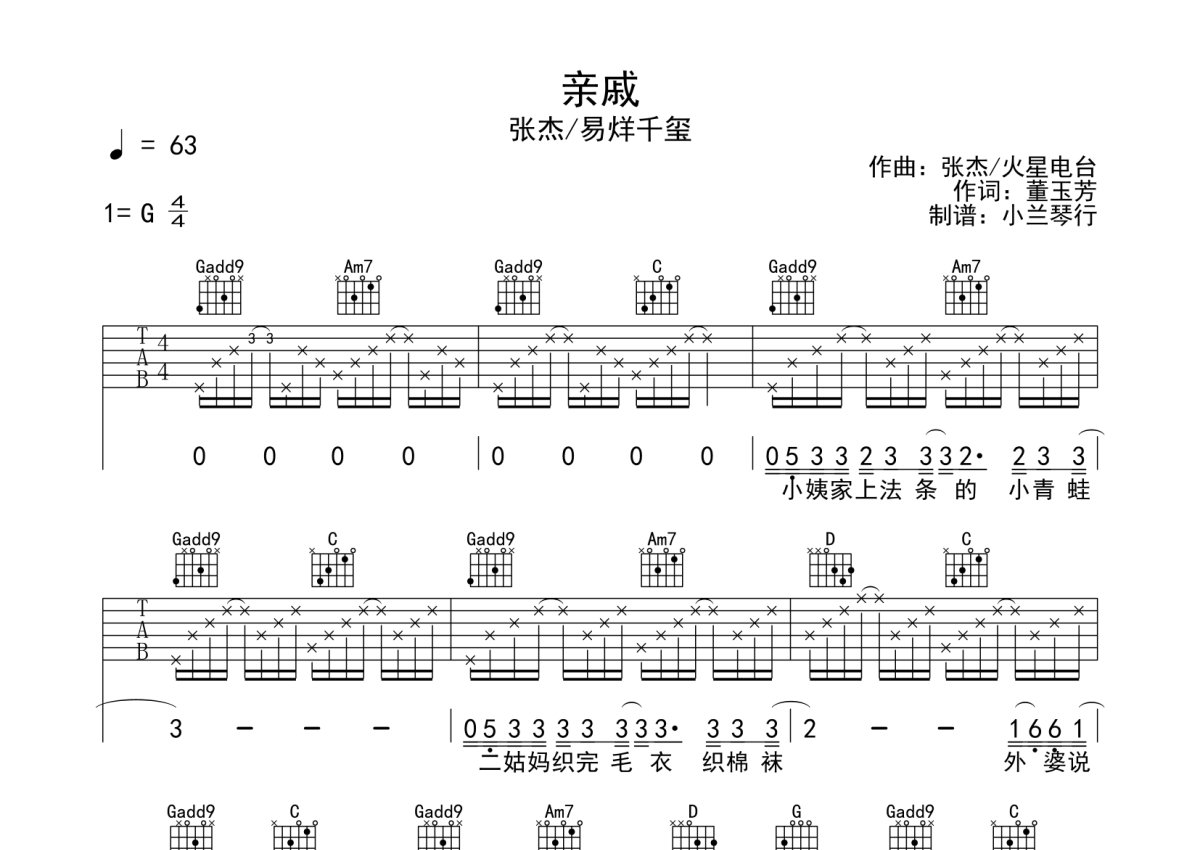 张杰/易烊千玺《亲戚》吉他谱 - G调弹唱六线谱