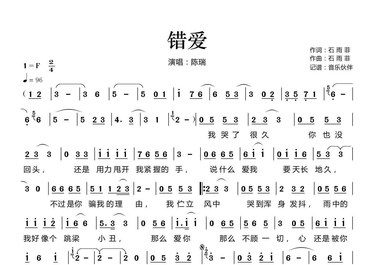 《错爱》是陈瑞演唱的一首歌曲,拍号为2/4拍,歌曲速度为每分钟96拍,这份简谱共有一张高清图谱,图谱由 @音乐伙伴 编配上传。