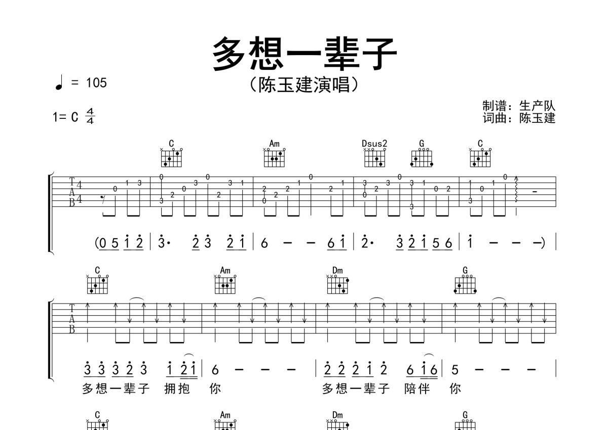 《多想一辈子》是陈玉建演唱的一首歌曲,精编完美版,拍号为4/4拍,歌曲速度为每分钟105拍,歌曲原调为C调,本吉他谱采用的是C调指法编配,演奏时不需要使用变调夹即为原调,这份吉他谱共有三张高清图谱,图谱由 @生产队 编配上传,图谱使用六线谱编配,包含吉他和弦指法、简谱以及歌词部分,使用这份多想一辈子吉他谱,可以让你更加方便地掌握这首歌曲的弹唱技巧,快来尝试吧。陈玉建作词、作曲并演唱的歌曲《多想一辈子》原版吉他谱,含精准的前奏、间奏、尾奏solo编配,精编完美版,优质推荐!。