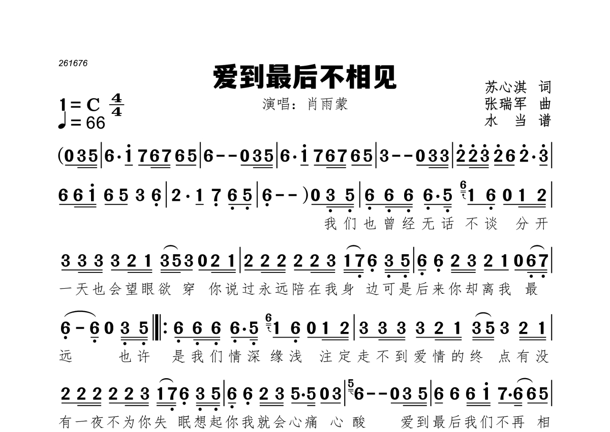 《爱到最后不相见》是肖雨蒙演唱的一首歌曲,拍号为4/4拍,歌曲速度为每分钟66拍,这份简谱共有一张高清图谱,图谱由 @水当 编配上传。