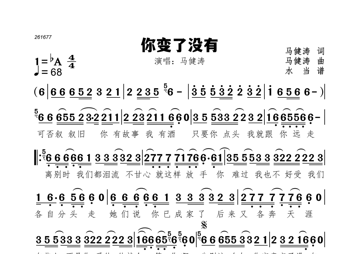 《你变了没有》是马健涛演唱的一首歌曲,拍号为4/4拍,歌曲速度为每分钟68拍,这份简谱共有一张高清图谱,图谱由 @水当 编配上传。