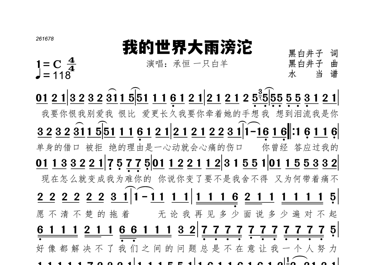 《我的世界大雨滂沱》是承恒&一只白羊演唱的一首歌曲,拍号为4/4拍,歌曲速度为每分钟118拍,这份简谱共有一张高清图谱,图谱由 @水当 编配上传。