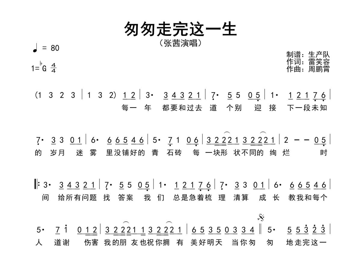 《匆匆走完这一生》是张茜演唱的一首歌曲,原版简谱,拍号为4/4拍,歌曲速度为每分钟80拍,这份简谱共有一张高清图谱,图谱由 @生产队 编配上传张茜演唱的歌曲《匆匆走完这一生》原版简谱,含精准的前奏、间奏solo编配,精编完美版,优质推荐!。