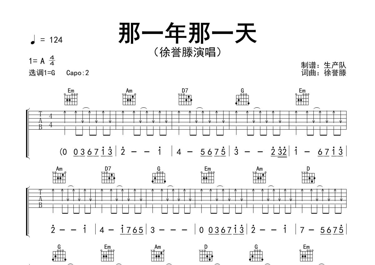 《那一年那一天》是徐誉滕演唱的一首歌曲,精编完美版,拍号为4/4拍,歌曲速度为每分钟124拍,歌曲原调为A调,但由于原调指法比较难,为了方便弹奏,本吉他谱采用的是G调指法编配,变调夹2品弹奏即为原调,当然也可以根据自己的音域改变变调夹位置,或者通过改变和弦调性,以方便自己弹奏,这份吉他谱共有三张高清图谱,图谱由 @生产队 编配上传,图谱使用六线谱编配,包含吉他和弦指法、简谱以及歌词部分,使用这份那一年那一天吉他谱,可以让你更加方便地掌握这首歌曲的弹唱技巧,快来尝试吧。徐誉滕作词、作曲并演唱的歌曲《那一年那一天》原版吉他谱,含精准的前奏、间奏solo编配,精编完美版,优质推荐!。