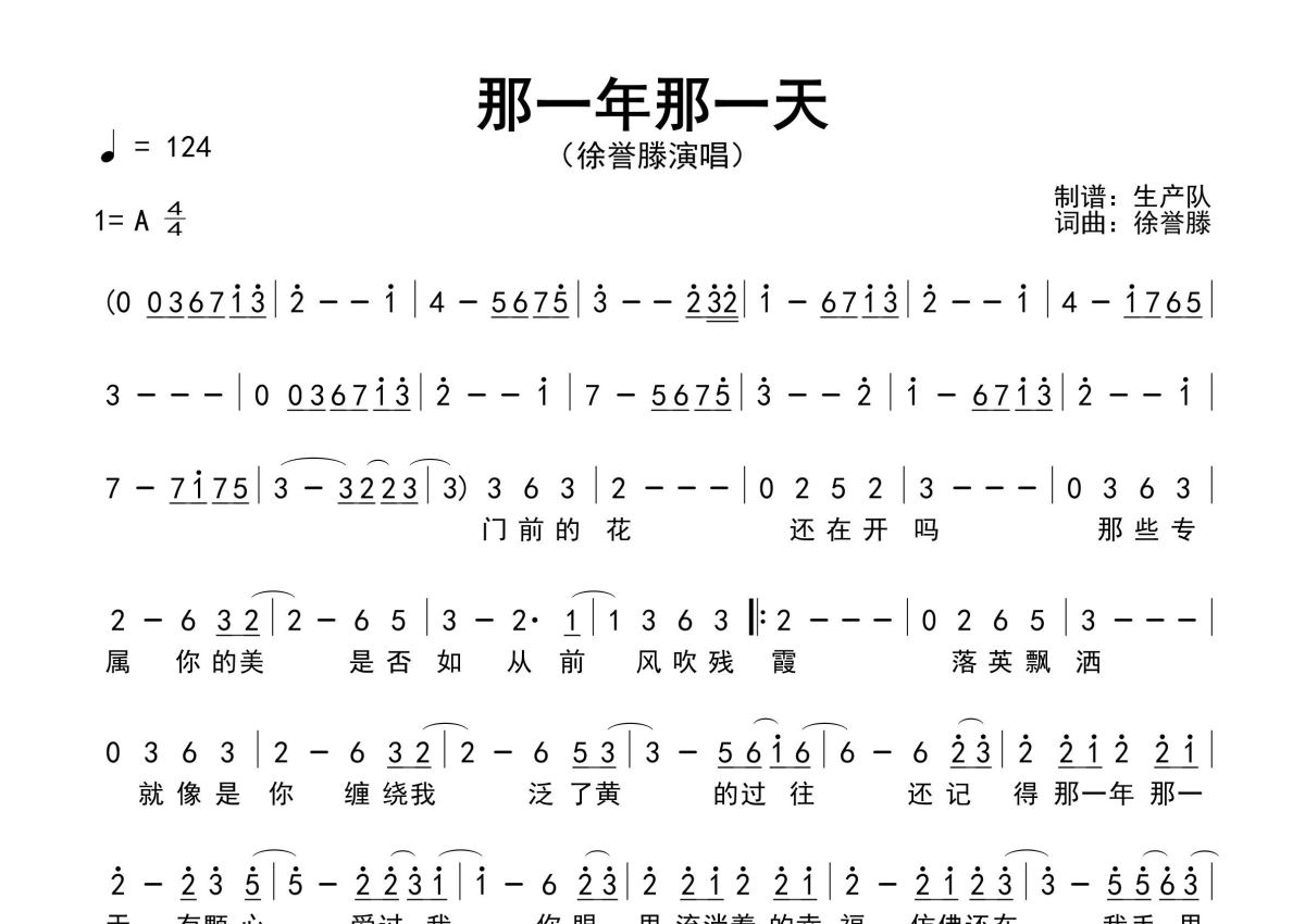 《那一年那一天》是徐誉滕演唱的一首歌曲,原版简谱,拍号为4/4拍,歌曲速度为每分钟124拍,这份简谱共有一张高清图谱,图谱由 @生产队 编配上传徐誉滕作词、作曲并演唱的歌曲《那一年那一天》原版简谱,含精准的前奏、间奏solo编配,精编完美版,优质推荐!。