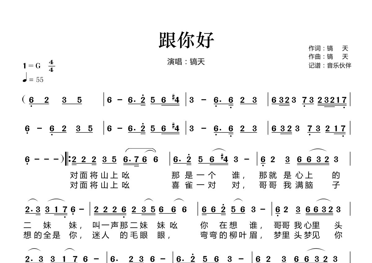 《跟你好》是镐天演唱的一首歌曲,拍号为4/4拍,歌曲速度为每分钟55拍,这份简谱共有一张高清图谱,图谱由 @音乐伙伴 编配上传。