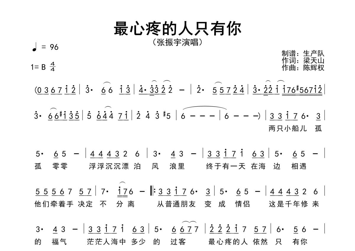 《最心疼的人只有你》是张振宇演唱的一首歌曲,原版简谱,拍号为4/4拍,歌曲速度为每分钟96拍,这份简谱共有一张高清图谱,图谱由 @生产队 编配上传张振宇演唱的歌曲《最心疼的人只有你》原版简谱,含精准的前奏、间奏solo编配,精编完美版,优质推荐!。