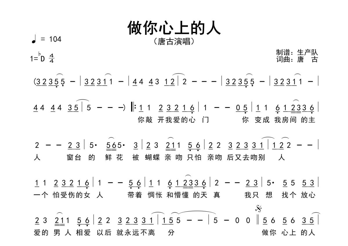 《做你心上的人》是唐古演唱的一首歌曲,原版简谱,拍号为4/4拍,歌曲速度为每分钟104拍,这份简谱共有一张高清图谱,图谱由 @生产队 编配上传唐古作词、作曲并演唱的歌曲《做你心上的人》原版简谱,含精准的前奏、间奏solo编配,精编完美版,优质推荐!。