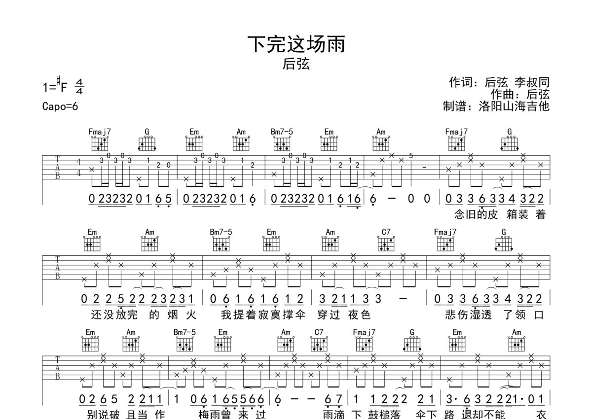 后弦《下完这场雨》吉他谱 - G调弹唱六线谱