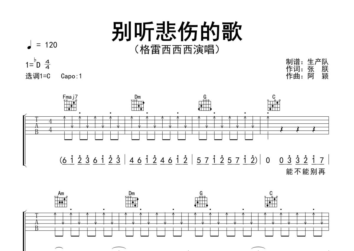 《别听悲伤的歌》是格雷西西西演唱的一首歌曲,精编完美版,拍号为4/4拍,歌曲速度为每分钟120拍,歌曲原调为Db调,但由于原调指法比较难,为了方便弹奏,本吉他谱采用的是C调指法编配,变调夹1品弹奏即为原调,当然也可以根据自己的音域改变变调夹位置,或者通过改变和弦调性,以方便自己弹奏,这份吉他谱共有三张高清图谱,图谱由 @生产队 编配上传,图谱使用六线谱编配,包含吉他和弦指法、简谱以及歌词部分,使用这份别听悲伤的歌吉他谱,可以让你更加方便地掌握这首歌曲的弹唱技巧,快来尝试吧。格雷西西西演唱的歌曲《别听悲伤的歌》原版吉他谱,含精准的前奏、间奏、尾奏solo编配,精编完美版,优质推荐!。