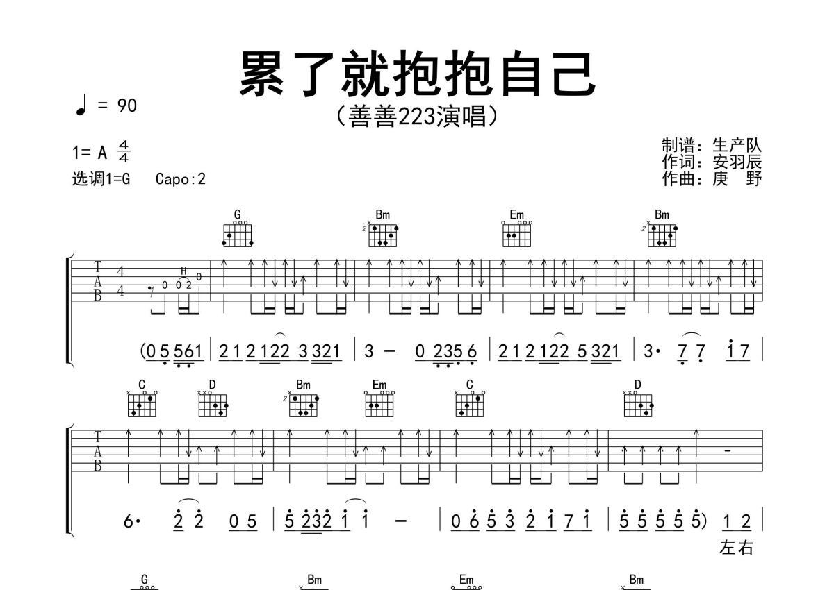 《累了就抱抱自己》是善善²²³演唱的一首歌曲,精编完美版,拍号为4/4拍,歌曲速度为每分钟90拍,歌曲原调为A调,但由于原调指法比较难,为了方便弹奏,本吉他谱采用的是G调指法编配,变调夹2品弹奏即为原调,当然也可以根据自己的音域改变变调夹位置,或者通过改变和弦调性,以方便自己弹奏,这份吉他谱共有三张高清图谱,图谱由 @生产队 编配上传,图谱使用六线谱编配,包含吉他和弦指法、简谱以及歌词部分,使用这份累了就抱抱自己吉他谱,可以让你更加方便地掌握这首歌曲的弹唱技巧,快来尝试吧。善善²²³演唱的歌曲《累了就抱抱自己》原版吉他谱,含精准的前奏、间奏、尾奏solo编配,精编完美版,优质推荐!。