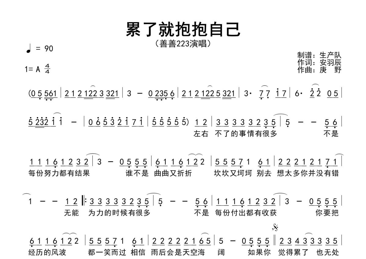 《累了就抱抱自己》是善善²²³演唱的一首歌曲,原版简谱,拍号为4/4拍,歌曲速度为每分钟90拍,这份简谱共有一张高清图谱,图谱由 @生产队 编配上传善善²²³演唱的歌曲《累了就抱抱自己》原版简谱,含精准的前奏、间奏、尾奏solo编配,精编完美版,优质推荐!。