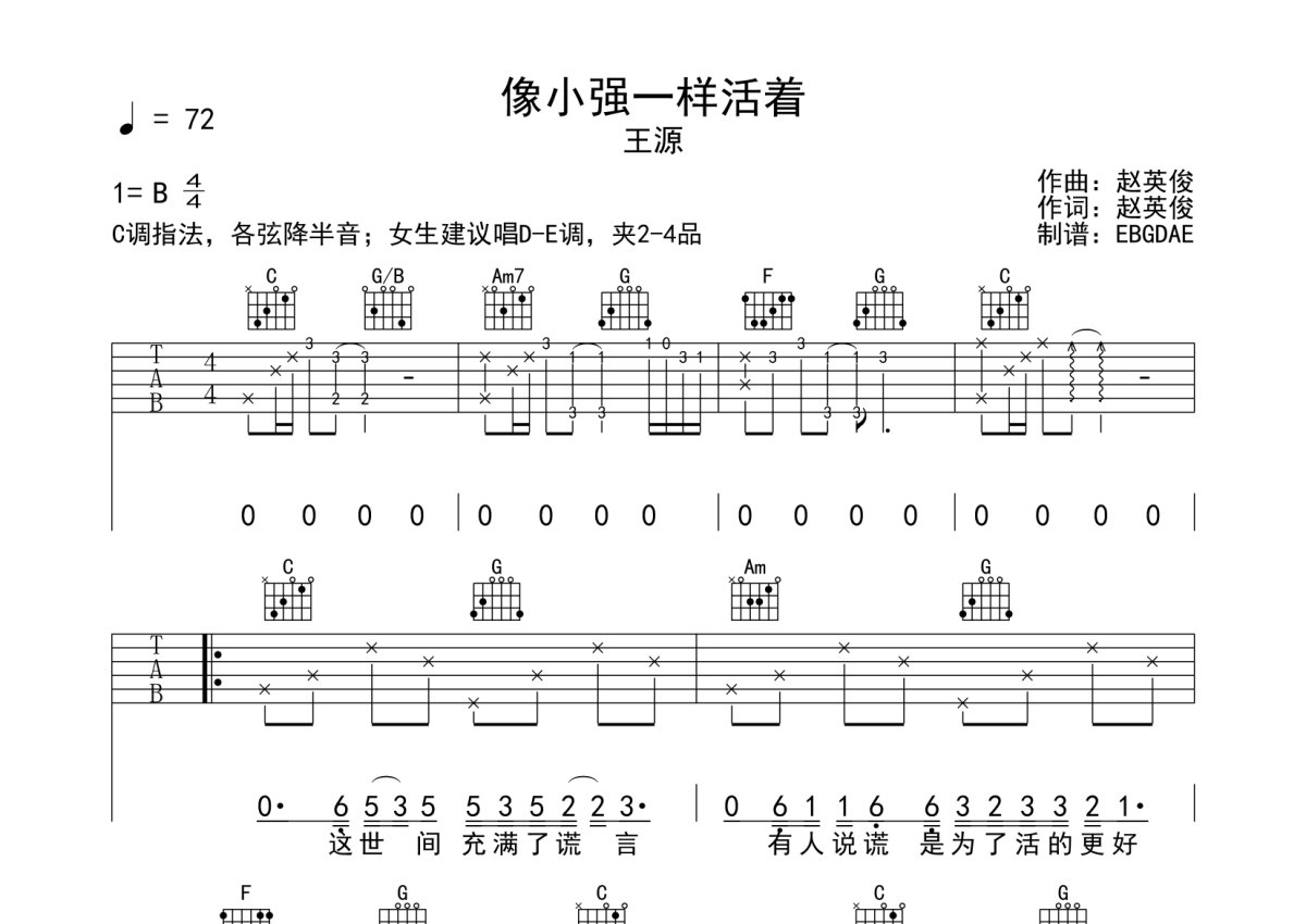 王源《像小强一样活着》吉他谱 - C调弹唱六线谱