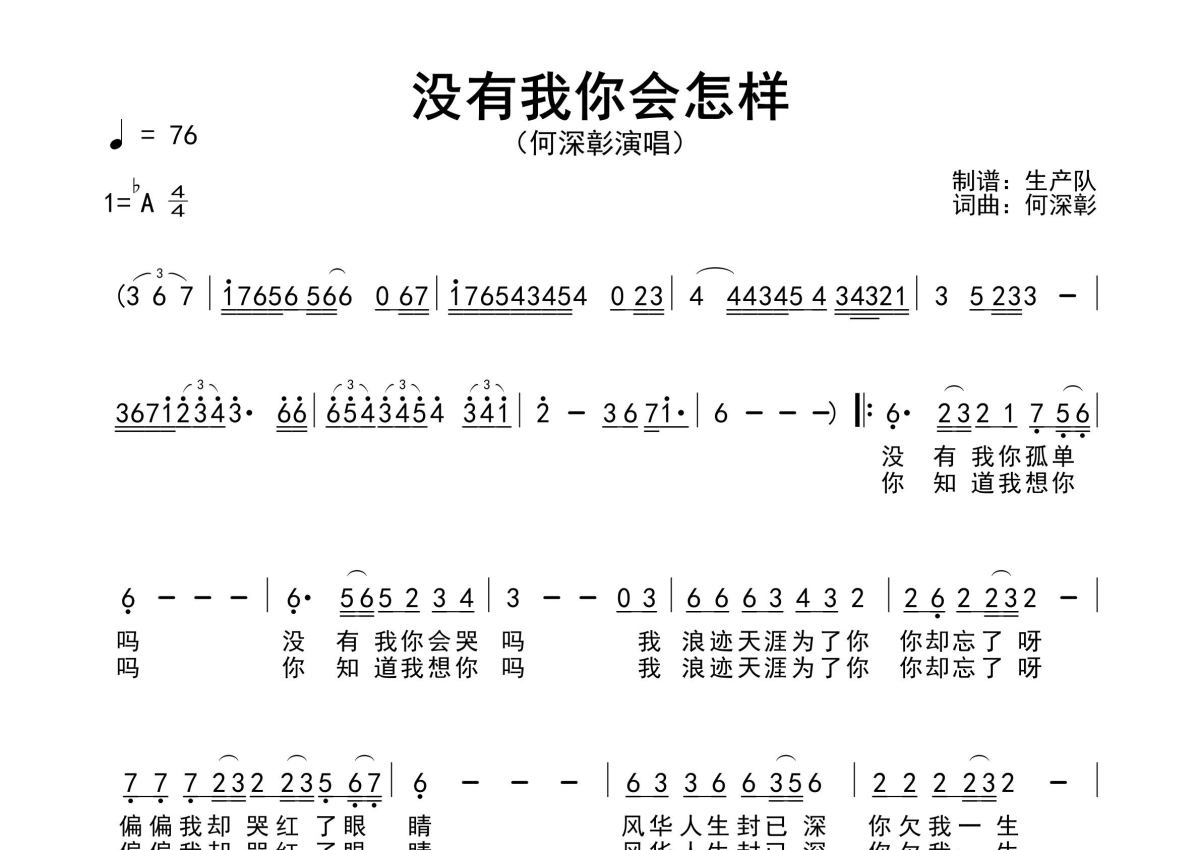 《没有我你会怎样》是何深彰演唱的一首歌曲,原版简谱,拍号为4/4拍,歌曲速度为每分钟76拍,这份简谱共有一张高清图谱,图谱由 @生产队 编配上传何深彰演唱的歌曲《没有我你会怎样》原版简谱,含精准的前奏、间奏、尾奏solo编配,精编完美版,优质推荐!。
