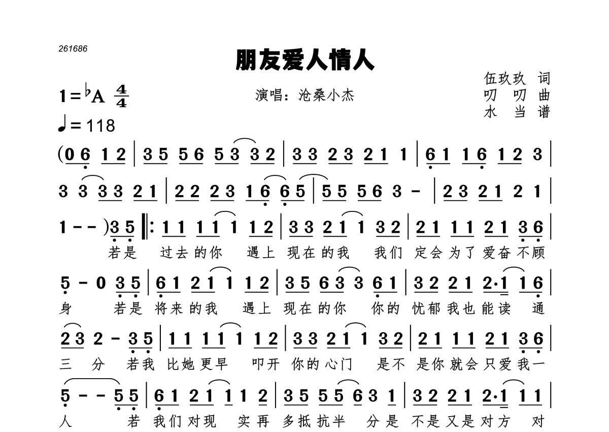 《朋友爱人情人》是沧桑小杰演唱的一首歌曲,拍号为4/4拍,歌曲速度为每分钟118拍,这份简谱共有一张高清图谱,图谱由 @水当 编配上传。