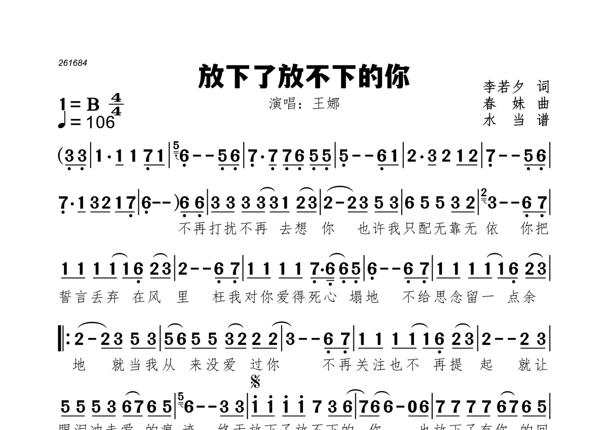 《放下了放不下的你》是王娜演唱的一首歌曲,拍号为4/4拍,歌曲速度为每分钟106拍,这份简谱共有一张高清图谱,图谱由 @水当 编配上传。