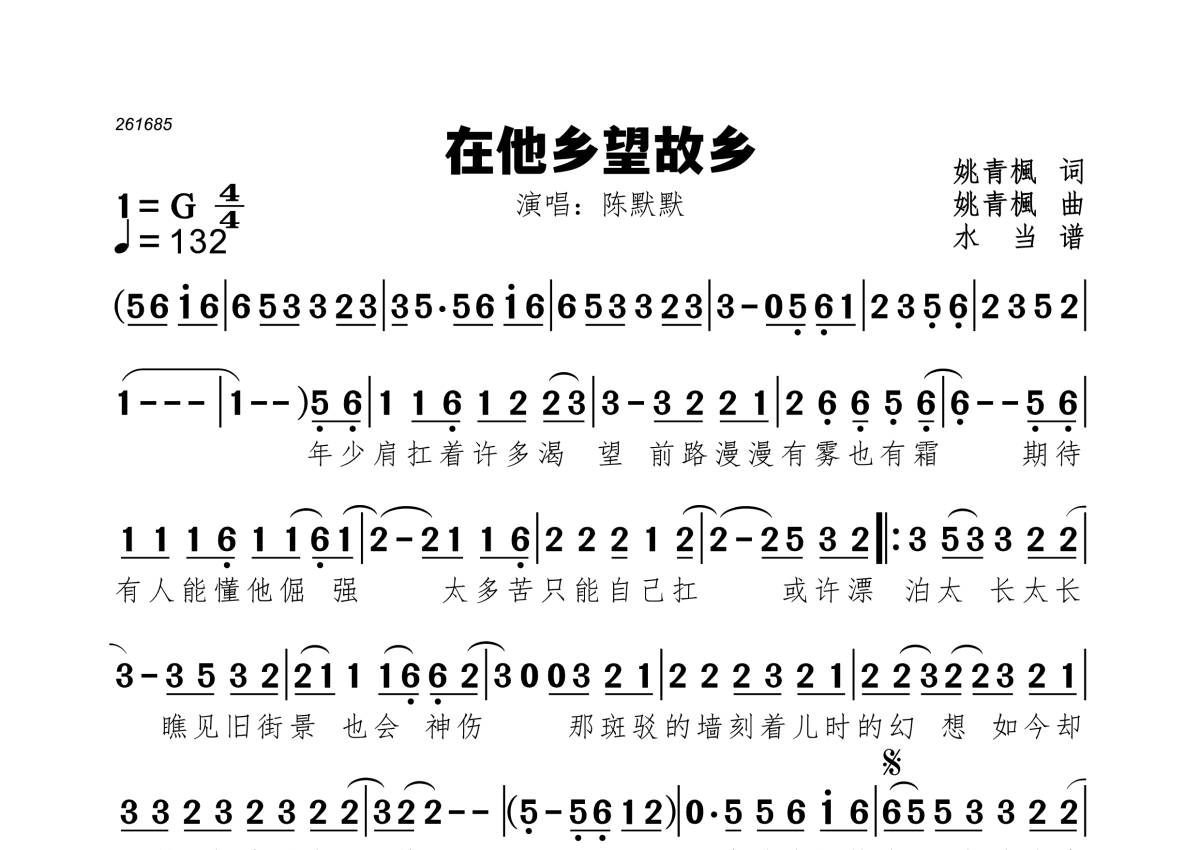 《在他乡望故乡》是陈默默演唱的一首歌曲,拍号为4/4拍,歌曲速度为每分钟132拍,这份简谱共有一张高清图谱,图谱由 @水当 编配上传。