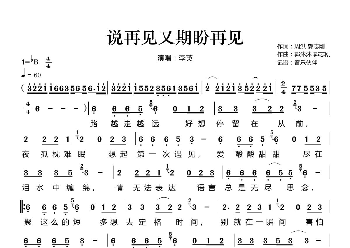《说再见又期盼再见》是李英演唱的一首歌曲,拍号为4/4拍,歌曲速度为每分钟60拍,这份简谱共有一张高清图谱,图谱由 @音乐伙伴 编配上传。