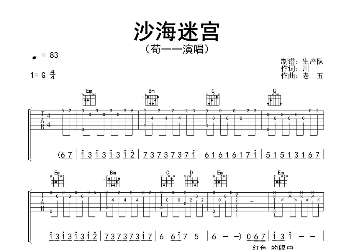 《沙海迷宫》是苟一一演唱的一首歌曲,精编完美版,拍号为4/4拍,歌曲速度为每分钟83拍,歌曲原调为G调,本吉他谱采用的是G调指法编配,演奏时不需要使用变调夹即为原调,这份吉他谱共有三张高清图谱,图谱由 @生产队 编配上传,图谱使用六线谱编配,包含吉他和弦指法、简谱以及歌词部分,使用这份沙海迷宫吉他谱,可以让你更加方便地掌握这首歌曲的弹唱技巧,快来尝试吧。苟一一演唱的歌曲《沙海迷宫》原版吉他谱,含精准的前奏、间奏solo编配,精编完美版,优质推荐!。