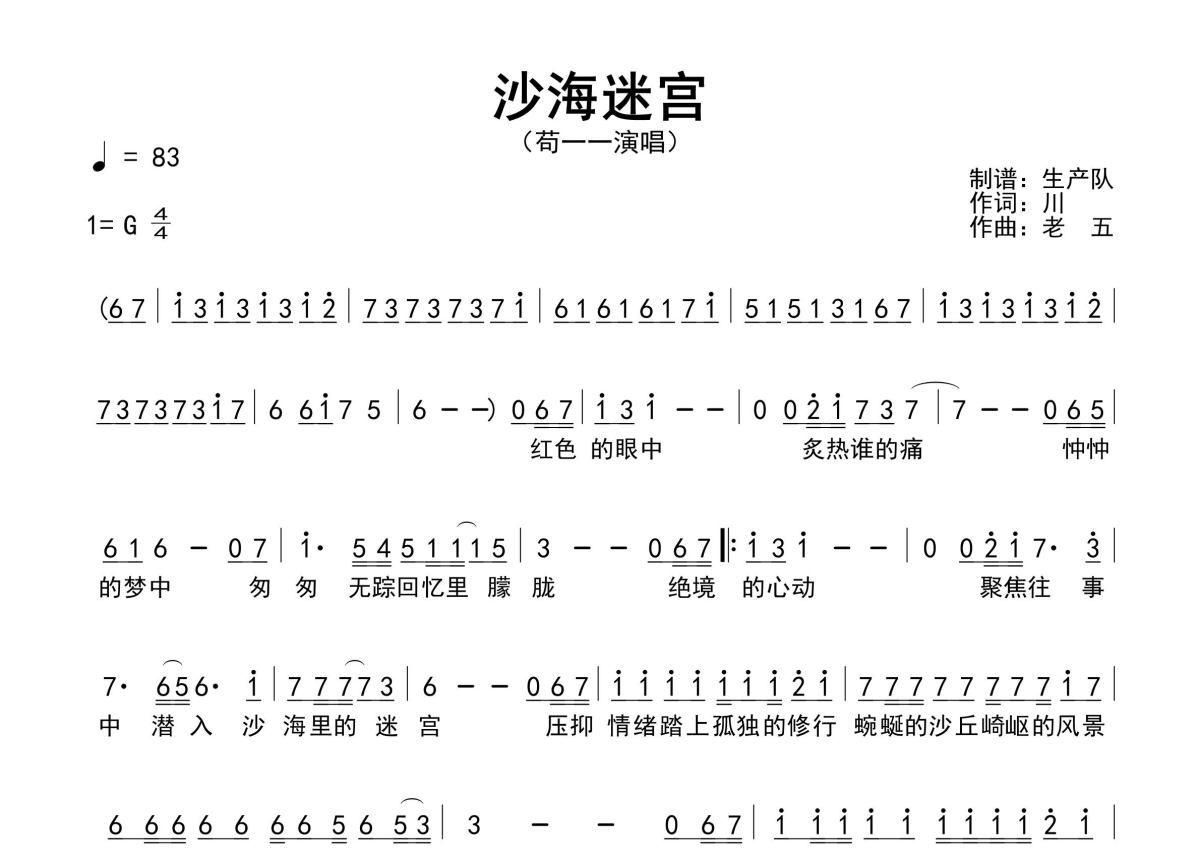 《沙海迷宫》是苟一一演唱的一首歌曲,原版简谱,拍号为4/4拍,歌曲速度为每分钟83拍,这份简谱共有一张高清图谱,图谱由 @生产队 编配上传苟一一演唱的歌曲《沙海迷宫》原版简谱,含精准的前奏、间奏solo编配,精编完美版,优质推荐!。