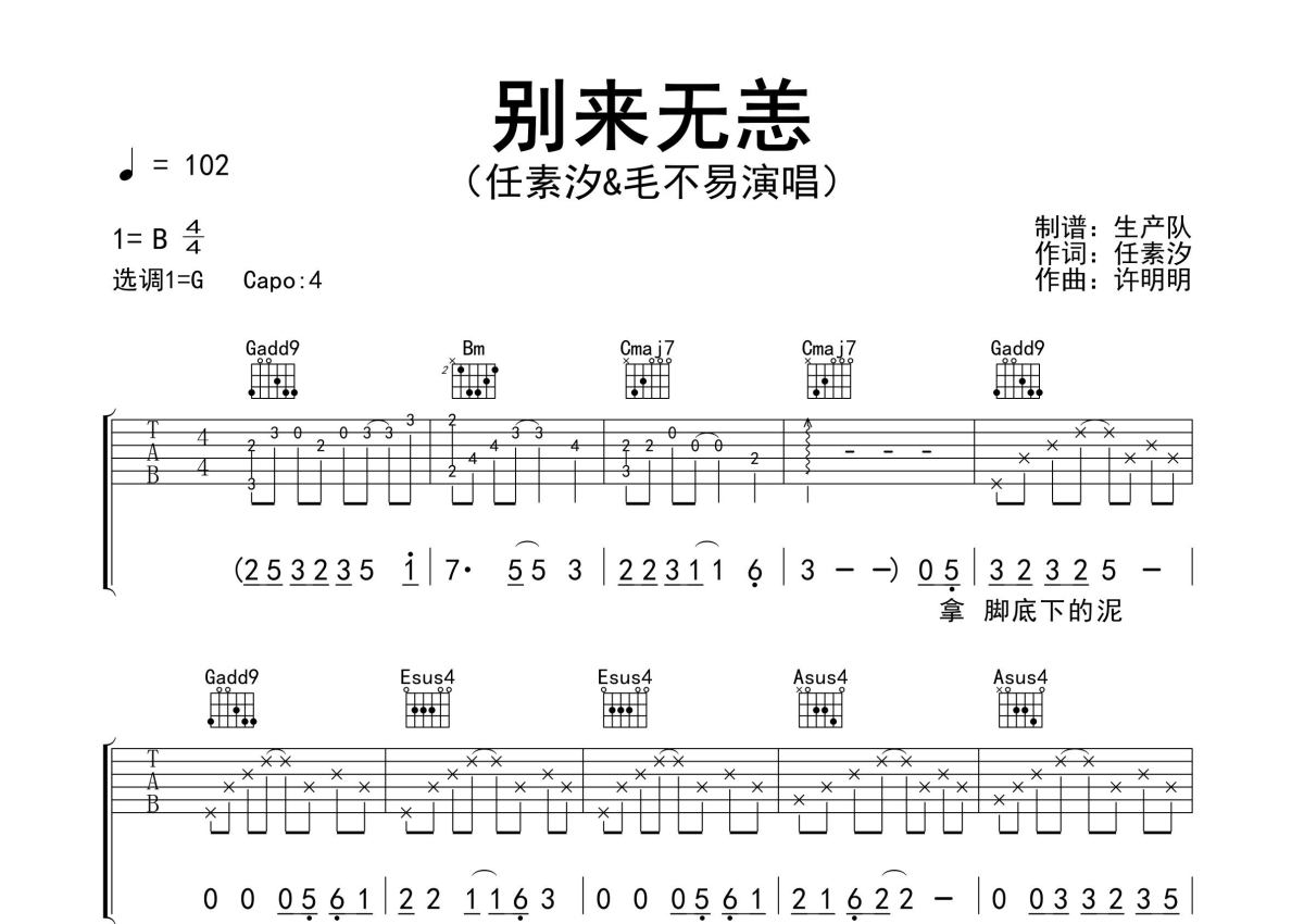 《别来无恙》是任素汐&毛不易演唱的一首歌曲,精编完美版,拍号为4/4拍,歌曲速度为每分钟102拍,歌曲原调为B调,但由于原调指法比较难,为了方便弹奏,本吉他谱采用的是G调指法编配,变调夹4品弹奏即为原调,当然也可以根据自己的音域改变变调夹位置,或者通过改变和弦调性,以方便自己弹奏,这份吉他谱共有三张高清图谱,图谱由 @生产队 编配上传,图谱使用六线谱编配,包含吉他和弦指法、简谱以及歌词部分,使用这份别来无恙吉他谱,可以让你更加方便地掌握这首歌曲的弹唱技巧,快来尝试吧。任素汐&毛不易演唱的歌曲《别来无恙》原版吉他谱,含精准的前奏、间奏solo编配,精编完美版,优质推荐!。