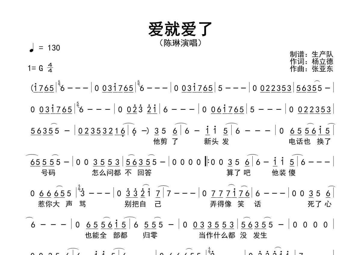《爱就爱了》是陈琳演唱的一首歌曲,原版简谱,拍号为4/4拍,歌曲速度为每分钟130拍,这份简谱共有一张高清图谱,图谱由 @生产队 编配上传陈琳演唱的歌曲《爱就爱了》原版简谱,含精准的前奏、间奏、尾奏solo编配,精编完美版,优质推荐!。