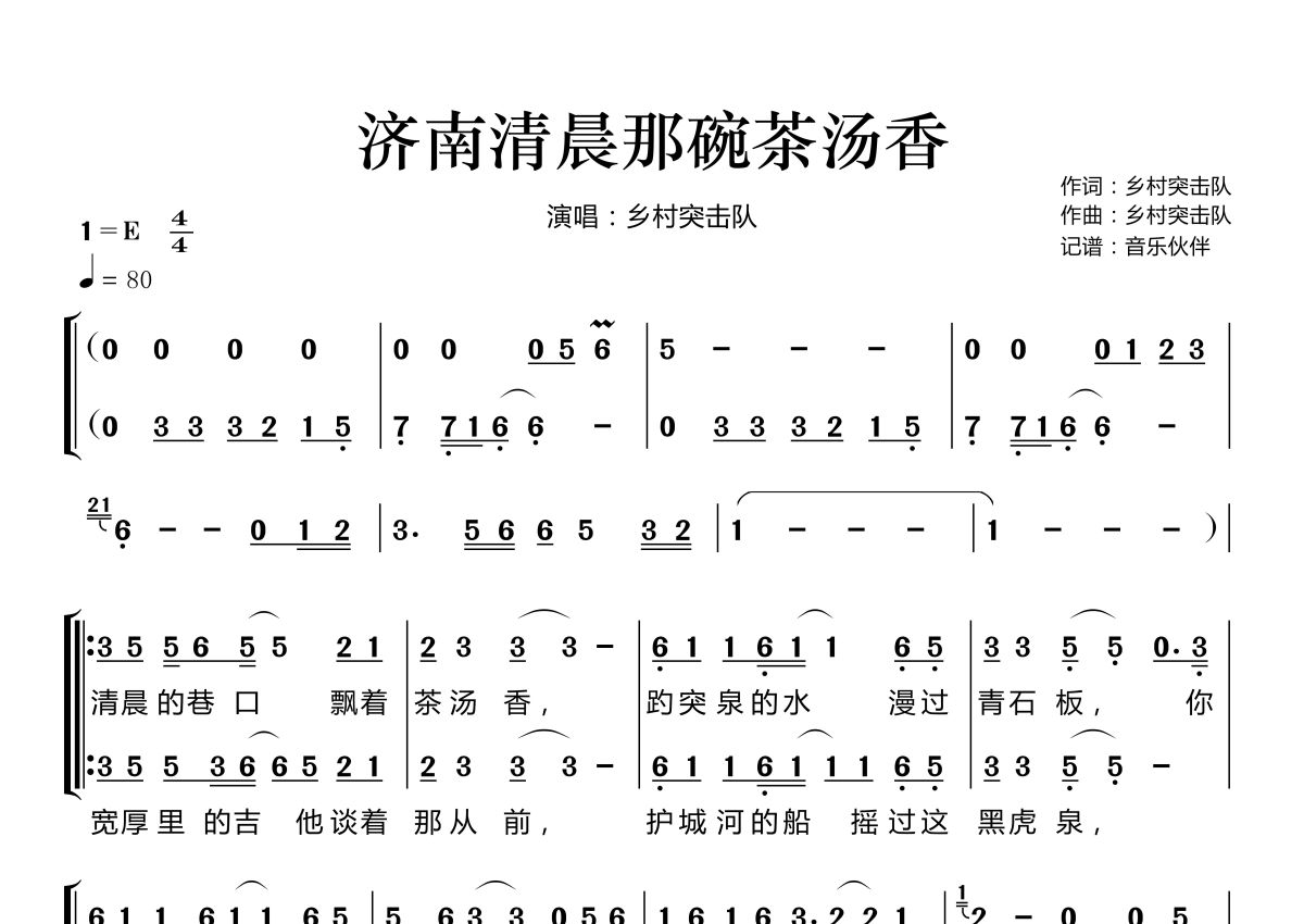 《济南清晨那碗茶汤香》是乡村突击队演唱的一首歌曲,拍号为4/4拍,歌曲速度为每分钟80拍,这份简谱共有两张高清图谱,图谱由 @音乐伙伴 编配上传。