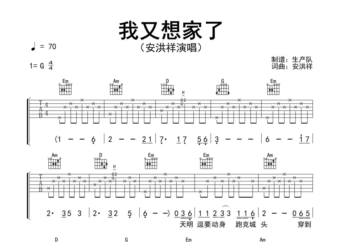 安洪祥《我又想家了》吉他谱 - G调弹唱六线谱 - 精编完美版