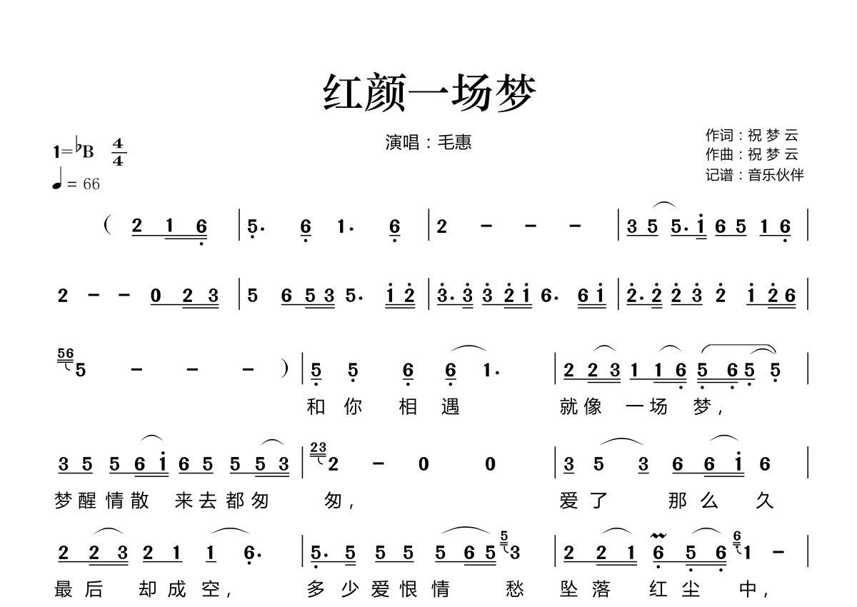 《红颜一场梦》是毛惠演唱的一首歌曲,拍号为4/4拍,歌曲速度为每分钟66拍,这份简谱共有两张高清图谱,图谱由 @音乐伙伴 编配上传。