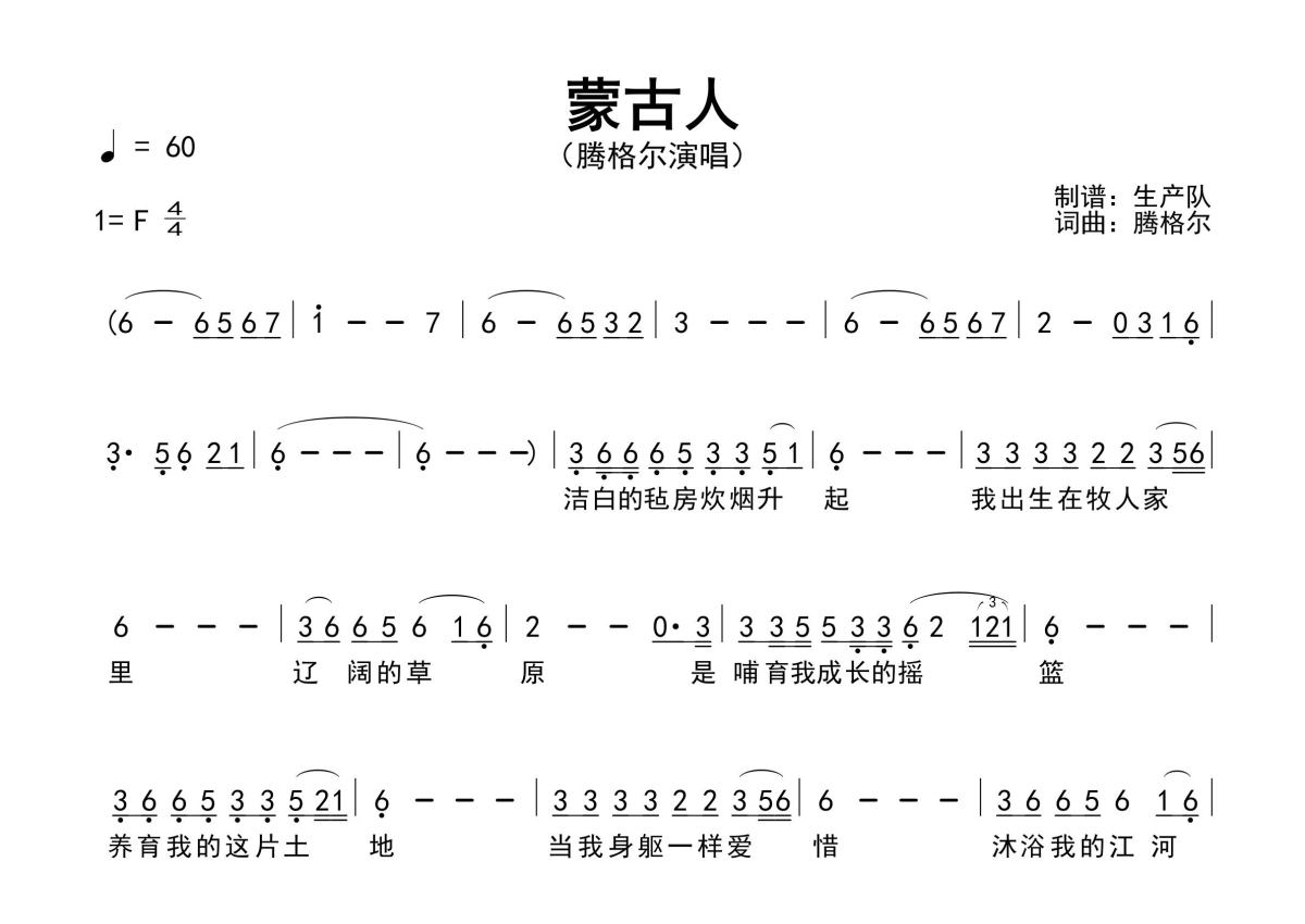 《蒙古人》是腾格尔演唱的一首歌曲,原版简谱,拍号为4/4拍,歌曲速度为每分钟60拍,这份简谱共有一张高清图谱,图谱由 @生产队 编配上传腾格尔作词、作曲并演唱的歌曲《蒙古人》原版简谱,含精准的前奏、间奏solo编配,精编完美版,优质推荐!。