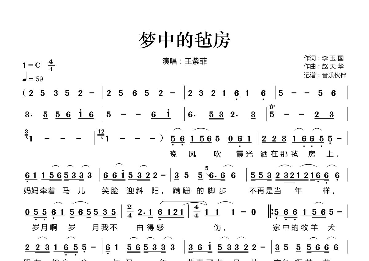 《梦中的毡房》简谱 - 王紫菲