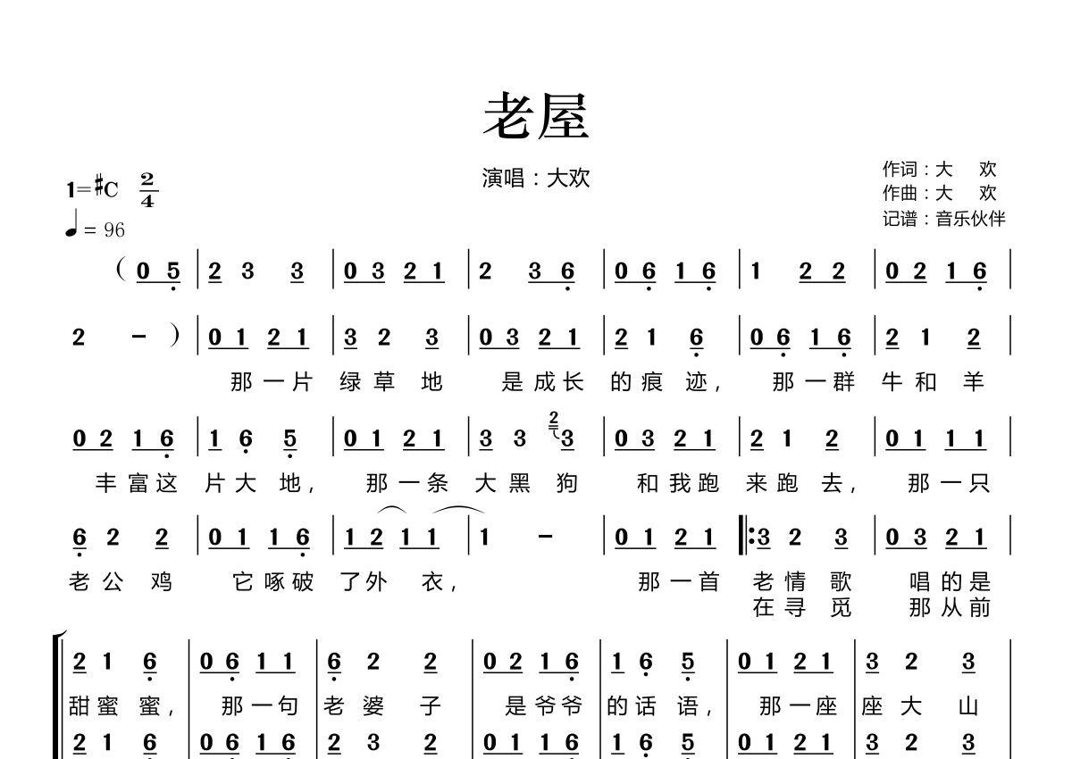 《老屋》是大欢演唱的一首歌曲,拍号为2/4拍,歌曲速度为每分钟96拍,这份简谱共有两张高清图谱,图谱由 @音乐伙伴 编配上传。