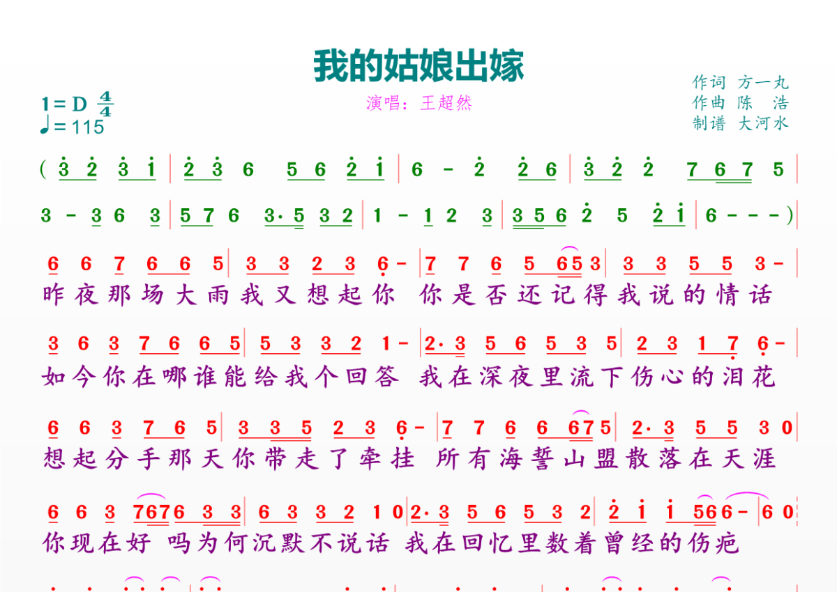 《我的姑娘出嫁》是王超然演唱的一首歌曲,拍号为4/4拍,歌曲速度为每分钟115拍,这份简谱共有一张高清图谱,图谱由 @临海雪原 编配上传。