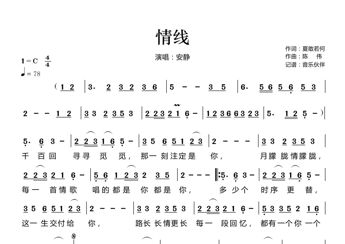 《情线》是安静演唱的一首歌曲,拍号为4/4拍,歌曲速度为每分钟78拍,这份简谱共有一张高清图谱,图谱由 @音乐伙伴 编配上传。