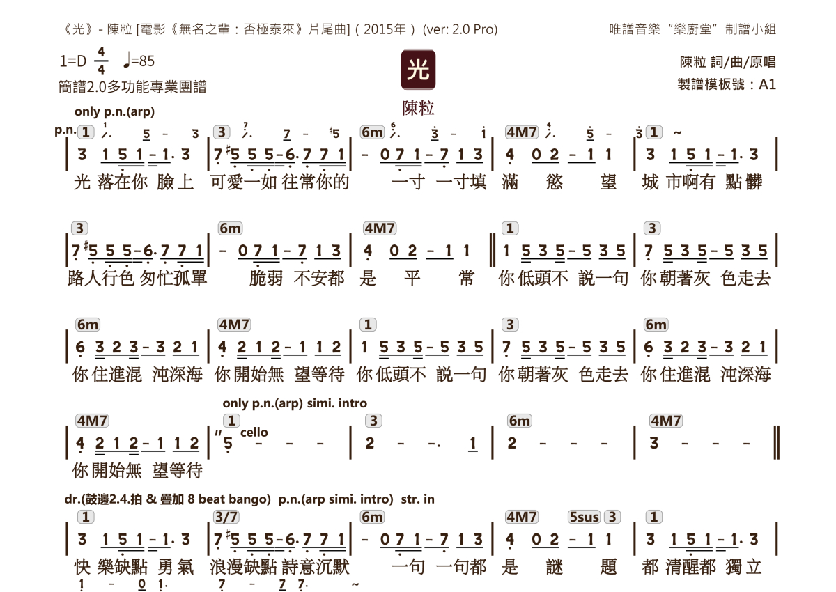 《光》是陈粒演唱的一首歌曲,2.0版多功能团谱,这份乐队总谱共有一张高清图谱,图谱由 @唯谱音乐"乐厨堂"发布小组 编配上传。
