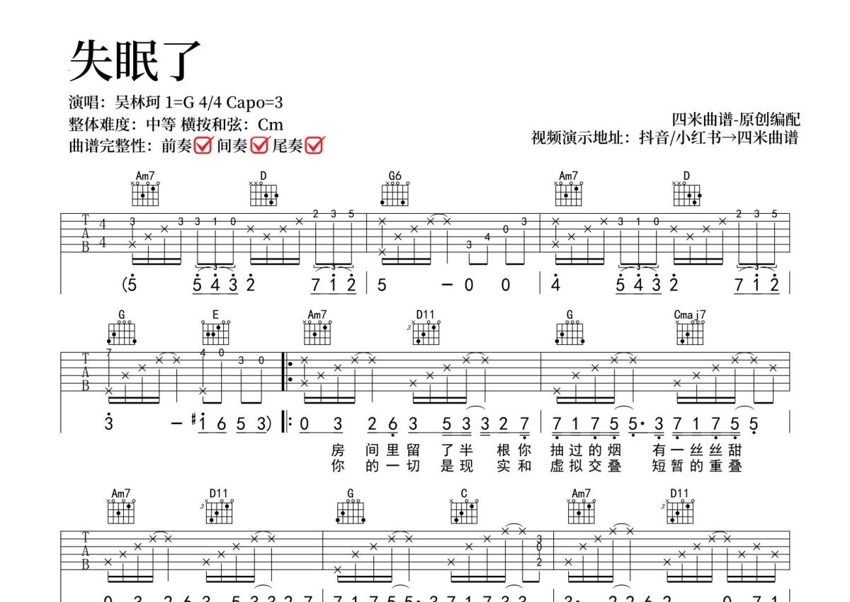吴琳珂(莫斯珂)《失眠了》吉他谱 - G调弹唱六线谱