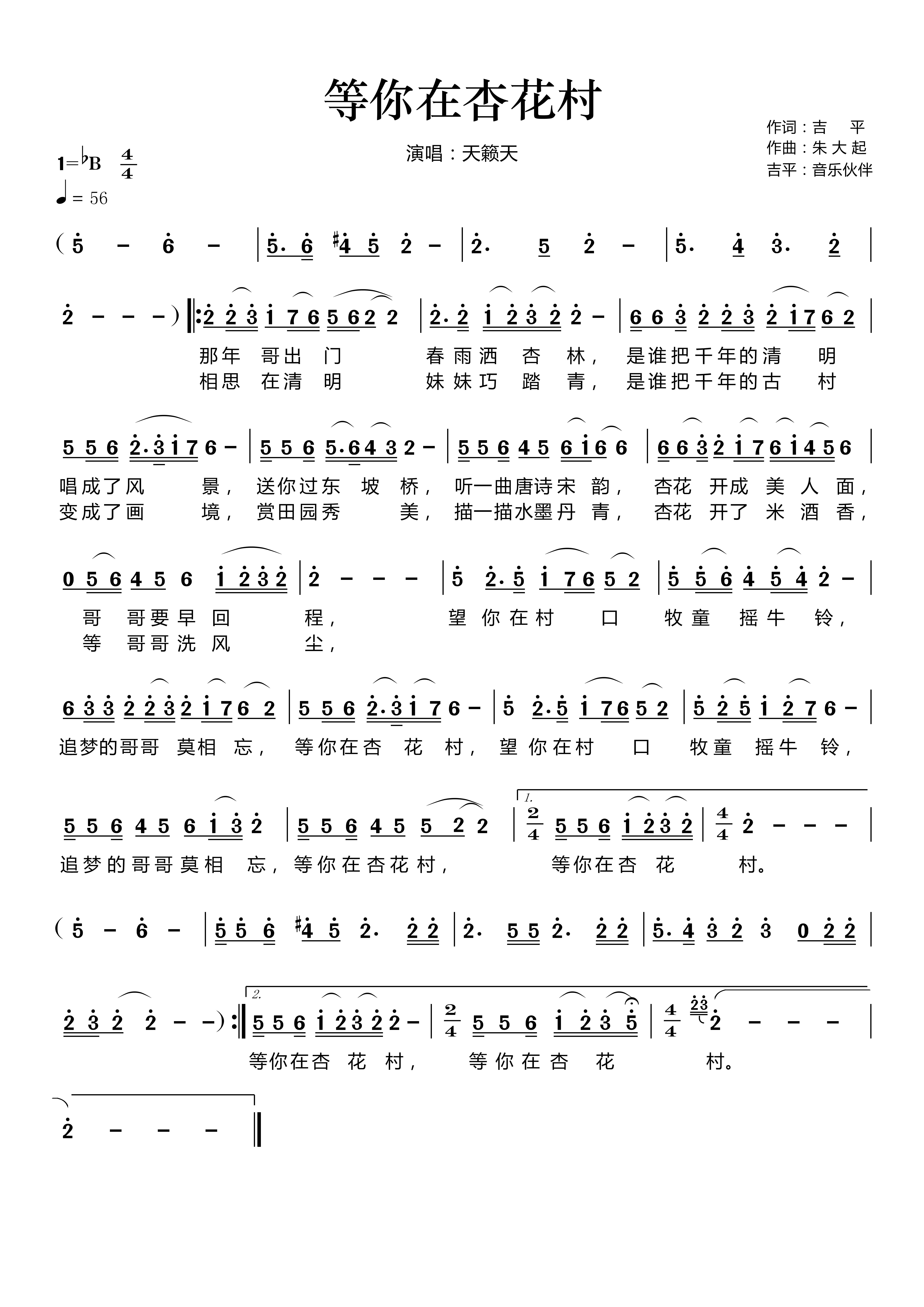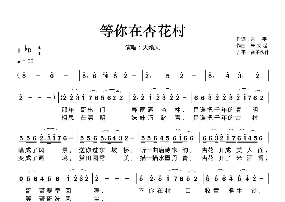 《等你在杏花村》是天籁天演唱的一首歌曲,拍号为4/4拍,歌曲速度为每分钟56拍,这份简谱共有一张高清图谱,图谱由 @音乐伙伴 编配上传。