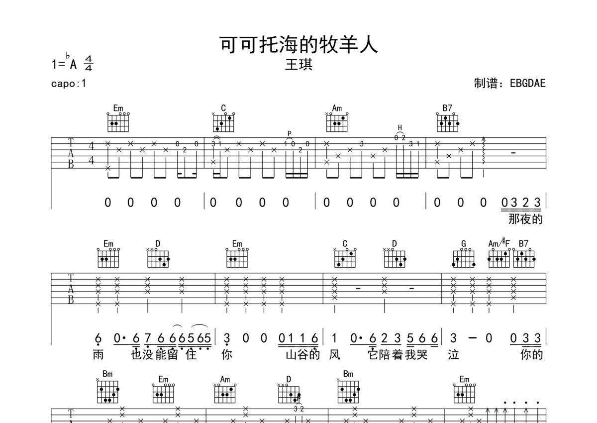 《可可托海的牧羊人》是王琪演唱的一首歌曲,本吉他谱采用的是G调指法编配,这份吉他谱共有两张高清图谱,图谱由 @EBGDAE 编配上传,图谱使用六线谱编配,包含吉他和弦指法、简谱以及歌词部分,使用这份可可托海的牧羊人吉他谱,可以让你更加方便地掌握这首歌曲的弹唱技巧,快来尝试吧。2张谱,免翻页排版设计。物美价廉,放心选购!加油!。