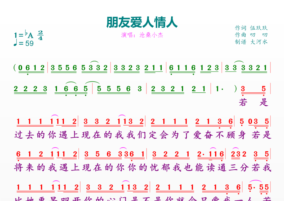 《朋友爱人情人》是沧桑小杰演唱的一首歌曲,拍号为2/4拍,歌曲速度为每分钟59拍,这份简谱共有一张高清图谱,图谱由 @临海雪原 编配上传。