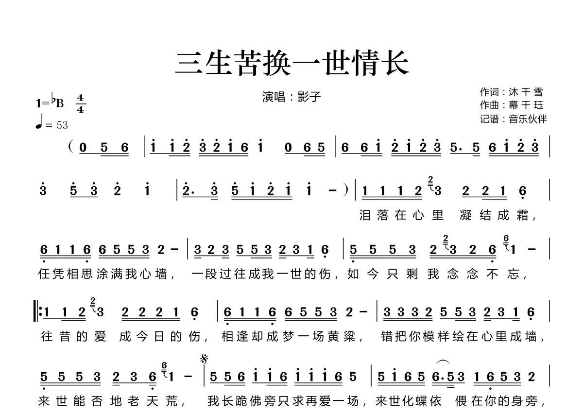 三生苦换一世情长简谱 - 影子演唱
