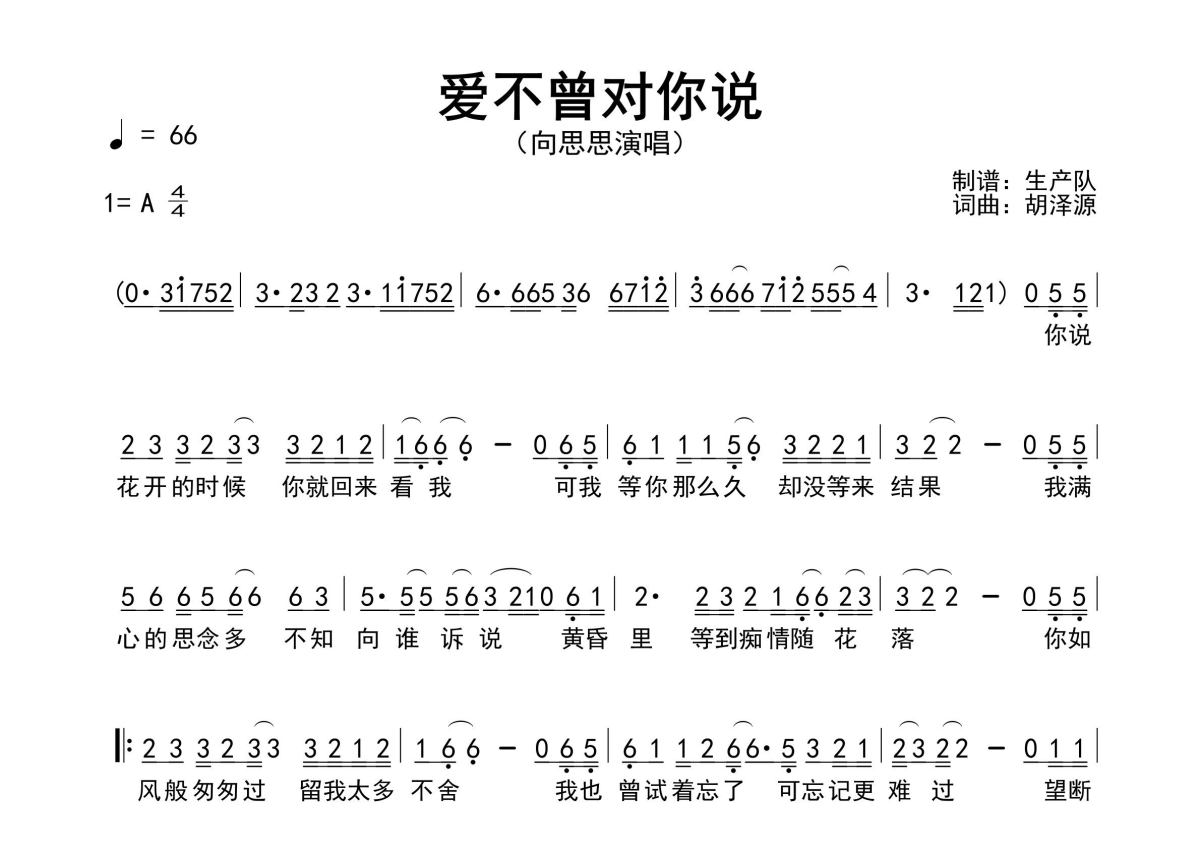 《爱不曾对你说》是向思思演唱的一首歌曲,原版简谱,拍号为4/4拍,歌曲速度为每分钟66拍,这份简谱共有一张高清图谱,图谱由 @生产队 编配上传向思思演唱的歌曲《爱不曾对你说》原版简谱,含精准的前奏、间奏、尾奏solo编配,精编完美版,优质推荐!。