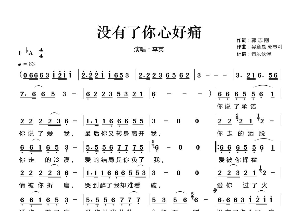 《没有了你心好痛》是李英演唱的一首歌曲,拍号为4/4拍,歌曲速度为每分钟83拍,这份简谱共有一张高清图谱,图谱由 @音乐伙伴 编配上传。