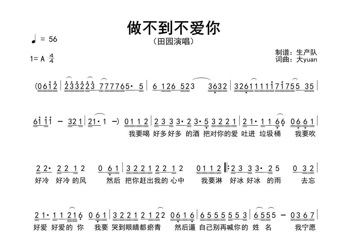 《做不到不爱你》是田园演唱的一首歌曲,原版简谱,拍号为4/4拍,歌曲速度为每分钟56拍,这份简谱共有一张高清图谱,图谱由 @生产队 编配上传田园演唱的歌曲《做不到不爱你》原版简谱,含精准的前奏、间奏solo编配,精编完美版,优质推荐!。