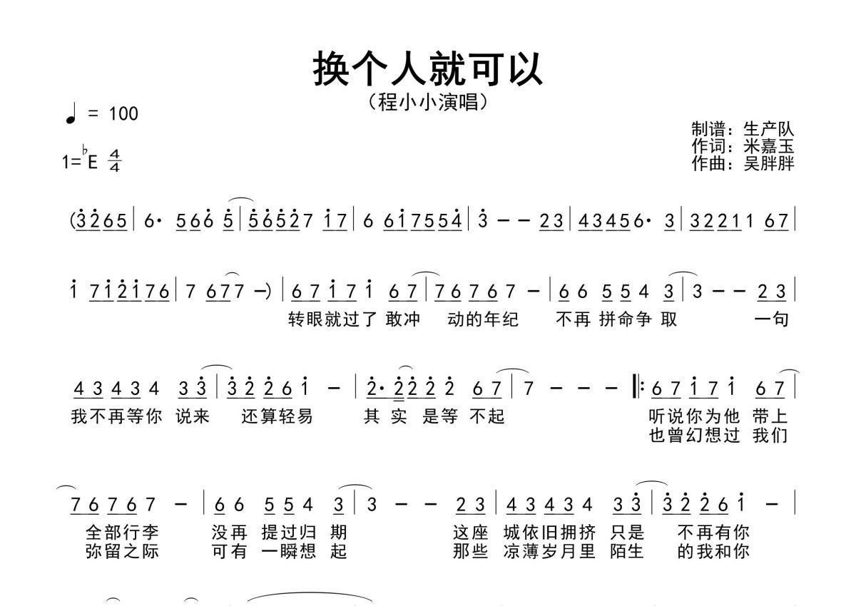 《换个人就可以》是程小小演唱的一首歌曲,原版简谱,拍号为4/4拍,歌曲速度为每分钟100拍,这份简谱共有一张高清图谱,图谱由 @生产队 编配上传程小小演唱的歌曲《换个人就可以》原版简谱,含精准的前奏、间奏solo编配,精编完美版,优质推荐!。