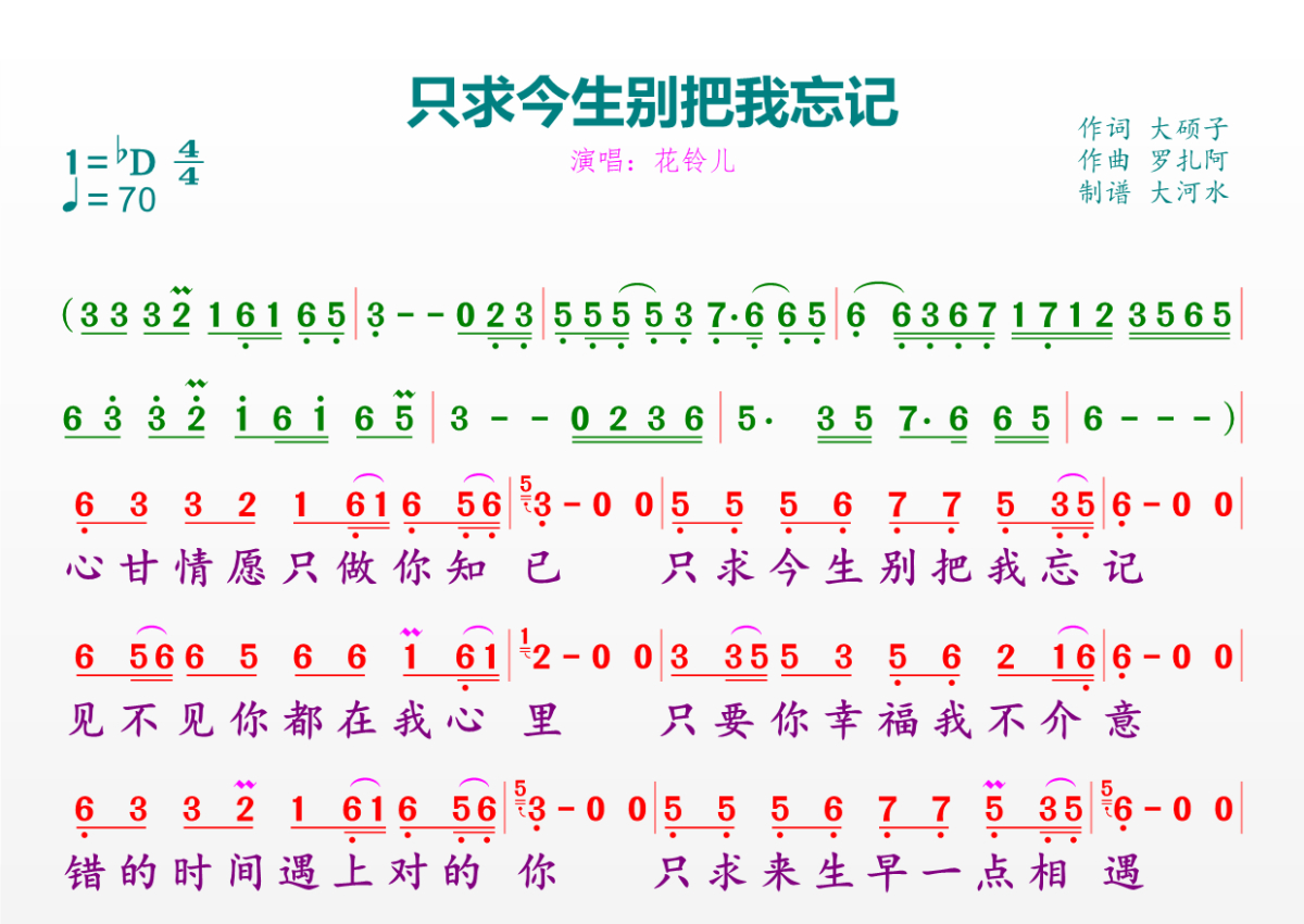 只求今生别把我忘记简谱 - 花铃儿演唱