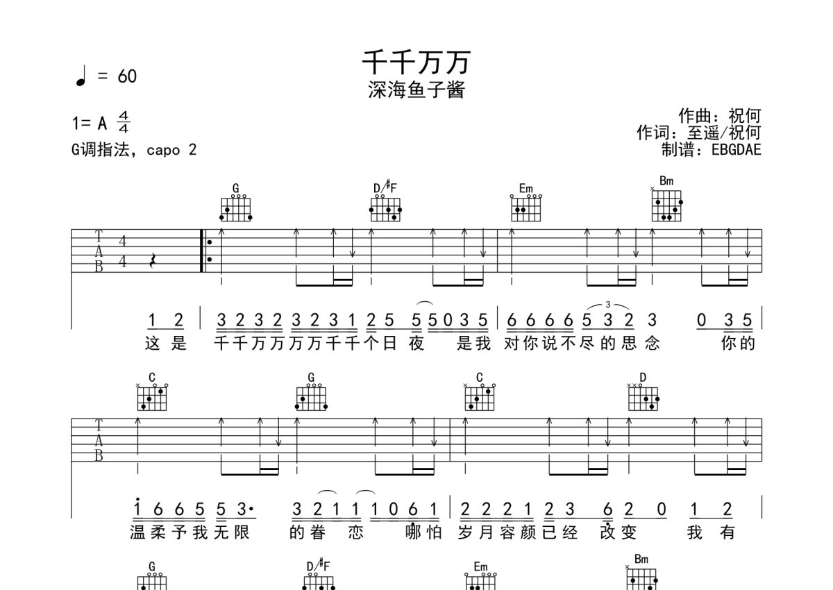 《千千万万》是深海鱼子酱演唱的一首歌曲,本吉他谱采用的是G调指法编配,这份吉他谱共有两张高清图谱,图谱由 @EBGDAE 编配上传,图谱使用六线谱编配,包含吉他和弦指法、简谱以及歌词部分,使用这份千千万万吉他谱,可以让你更加方便地掌握这首歌曲的弹唱技巧,快来尝试吧。2张谱,免翻页排版设计。物美价廉,放心选购!加油!。
