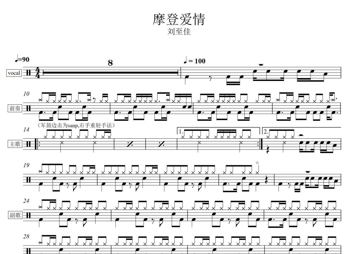 《摩登爱情》是刘至佳演唱的一首歌曲,拍号为4/4拍,歌曲速度为每分钟90拍,这份架子鼓谱共有两张高清图谱,图谱由 @音符喷血者 编配上传,图谱使用五线谱编配,使用这份摩登爱情架子鼓谱,你将能够轻松地敲打出这首刘至佳的摩登爱情,快来尝试吧。